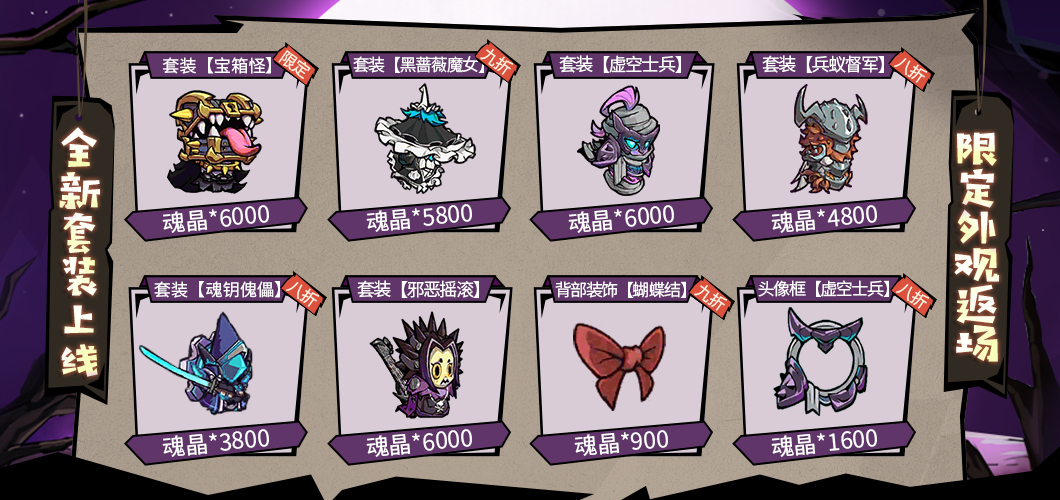 6. 全新套装-宝箱怪上线,海量套装返场!全新活动限定套装【宝箱怪】上架啦!售价6000魂晶。还有往期活动限定套装限时返场。不要错过啦!请及时兑换喜欢的套装吧!活动时间为3月19日11:00-4月1日23:59。