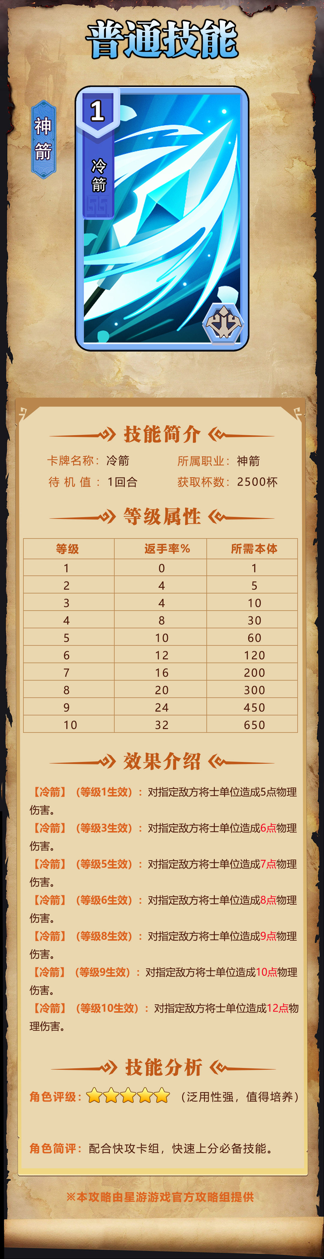 冷箭技能评级为五星,具有泛用性强,值得培养的特点。它可以配合快攻卡组使用,是快速上分的必备技能。