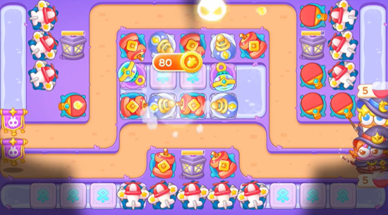 5、最后我们在中间得位置继续放置炮台,这里一定要使用减速泡泡,这一关的难度就在前期要锁头打,否则萝卜会被吃。
