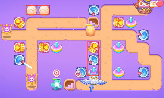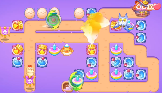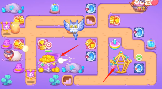 3、三把钥匙全部打掉之后救出猫头鹰听,此时我们再激活左下的金币道具,后面会很难清理,前期及时打掉。