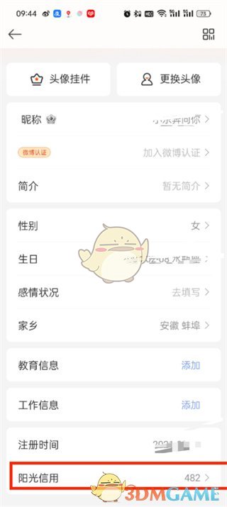 4、在个人资料页面中,向下滑动至底部,即可查看【信用分】。