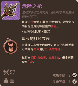 熔炉密林危险之枪攻击力为57,重量属于重型武器。该武器系列在击败瓜豆BOSS后解锁,使用时可以施放斗技为自己以及队友回复少量生命值,并且提升自身治疗能力。该系列武器的效果为:每次治疗量大于“们”点生命值时,对大范围内目标造成同等数值的伤害。治疗转化比率+100%。