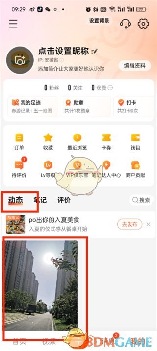 2、在我的页面中点击【动态】按钮,选择需要删除的打卡;