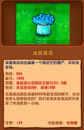 冰菇窝瓜是由寒冰菇和窝瓜杂交获得的植物,放置后不会立即消失,而是在消灭身边一个僵尸后造成全屏冰冻,有着冻结全场三秒,减速十五秒的特点。