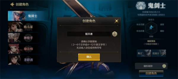 5、点击右下角的“昵称”自定义你的角色昵称,也可以随机设定,再点击“创建角色”,地下城与勇士起源手游昵称大全2024;