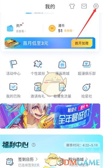 2、在个人中心中点击右上角的齿轮图标【设置】选项,进入设置界面。