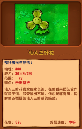 植物大战僵尸杂交版仙人三叶花改版后不再是一次性植物,新增功能为发射三枚尖刺子弹攻击敌人,可将敌人强制退后,与仙人三叶草的功能不同。仙人三叶花喜欢细水长流,在他看来团队合作就是王道,尽管输出不够,但也足够有用。
