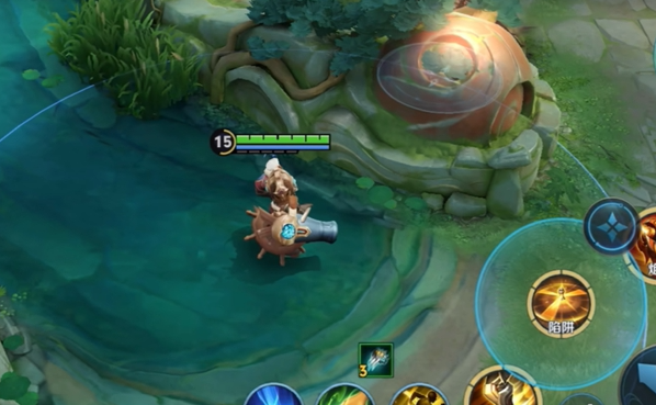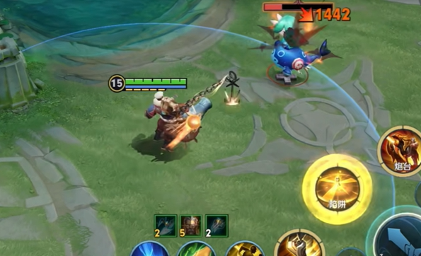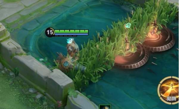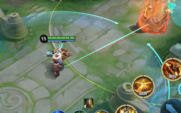 黄忠的二技能可以为自己提供护盾和20%的破甲,并且会使敌方造成减速和暴露视野,因而二技能的放雷有很多细节。一是只要二技能的中心放在草里,那么即使地雷露出了半截但是仍然不会暴露视野,除非二技能中心没有放在草里。所以我们放地雷是要尽可能的扔出来一半,这样即使敌人没有进草,但是仍然会踩到二技能,即变相增加二技能的范围。二是地雷的爆炸伤害要比指示器大半个身位左右。三是当我们往墙体内丢雷,地雷并不会扔进去,而是会被墙体向外卡出来,所以我们可以利用这个技巧将地雷向外卡出去,从而延长二技能的释放范围。