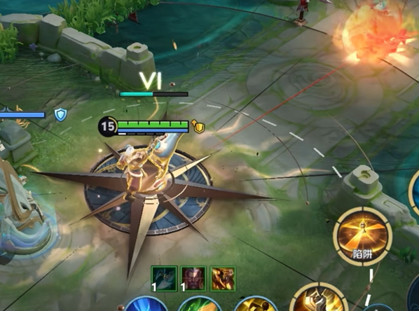 新版黄忠大招架炮时会获得一段位移,实战中我们可以靠这段位移穿墙,从而保障自身的安全,在此基础上我们可以提前在大招位移的终点放一颗雷。这样即使被对方刺客突进,我们还可以第一时间触发护盾来保命。当黄忠出了逐风之后,如果大招是手动取消便可以触发逐风被动,但是如果是炮弹打完或者是时间到了自动结束就不会触发逐风被动。所以我们在大招结束之后,可以先扔一发二技能来触发逐风和破甲效果,然后再与对方进行对拼。