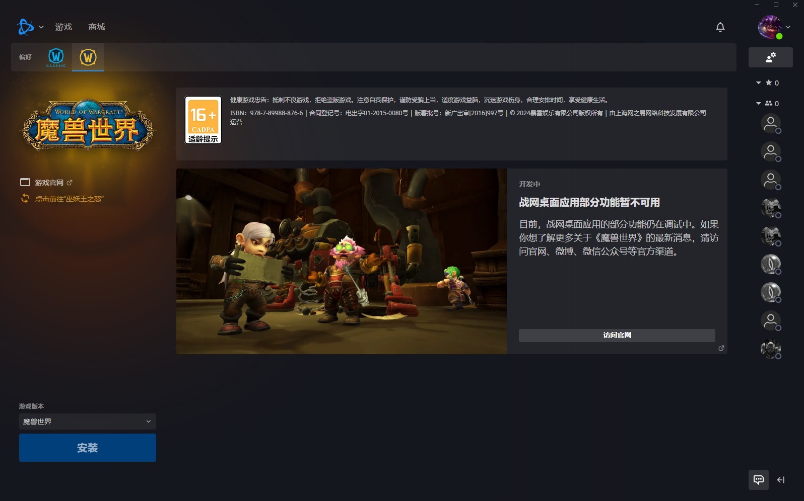 国服战网已经开放,客户端可供下载。登录战网需要访问暴雪国服战网登录页面(https://account.battlenet.com.cn/),输入国服账号即可进入账户信息页面。在账户概览页面找到下载战网选项,点击后直接下载国服战网。安装完成后即可登录账户。战网界面中只有魔兽世界怀旧服与正式服两个游戏可供选择。暂时无法安装魔兽世界正式服,但是可以安装巫妖王之怒怀旧服。
