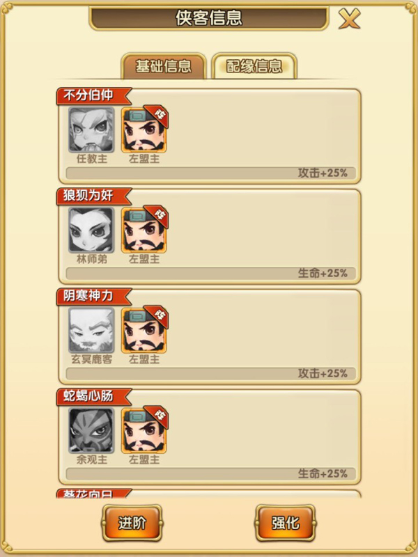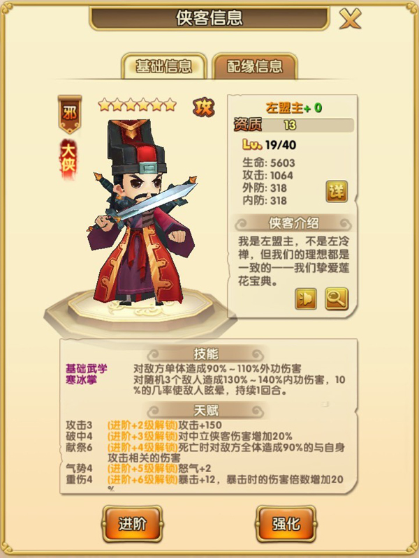 侠客天资:当侠客强化到一定级别后,侠客会开启本身独有的专属技能,提升很多独有属性,每一个侠客都有着天赋各有不同,当全部侠客的所有天资能力开启后,侠客的特征会更大化显现出来。