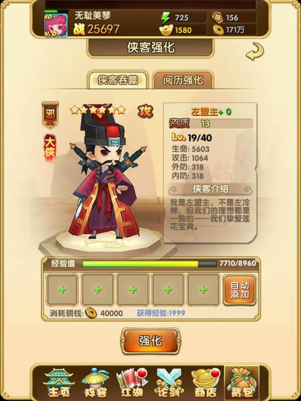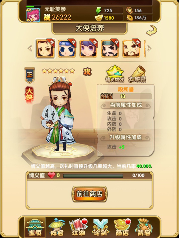 侠客的情意培养:侠客仅有侠客类型为侠客的侠客才可以进行培养,不包含主人公,大家可以根据耗费礼物提升与侠客好感度,而且有一定几率能直接更新,没次更新能增加一种属性值。