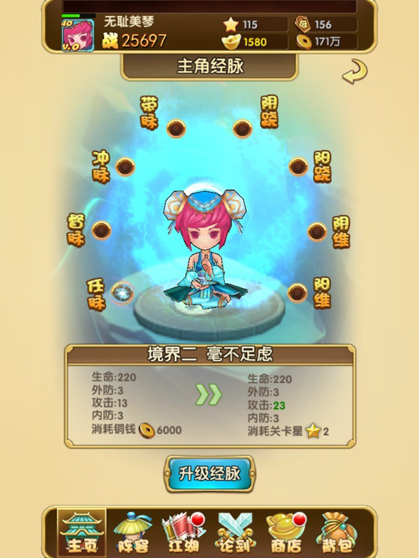 侠客经络培养:侠客的经络培养,仅有主人公才能够,根据耗费过关积分兑换和铜币能够更新女主的经络级别,经络每上升一级就后提高一种属性值,更新得到同样属性还能够累加。