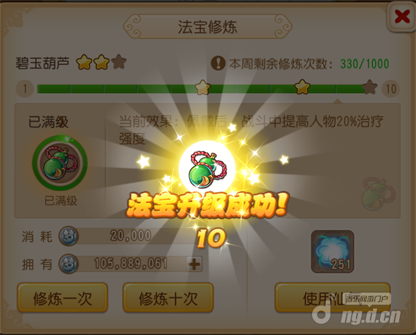 不一样法宝修炼必须耗费的硬币不一样,一部分法宝修炼一次耗费2万硬币,另一部分法宝修炼一次耗费3万硬币。