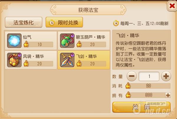 每周一、三、五的12:00会更新可兑换的法宝精华的类型。