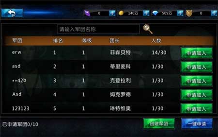 人物角色达到一定的级别后便能打开军团系统软件,玩家不但可以加入军团,还能够耗费金币或裸钻建立属于自己军团。