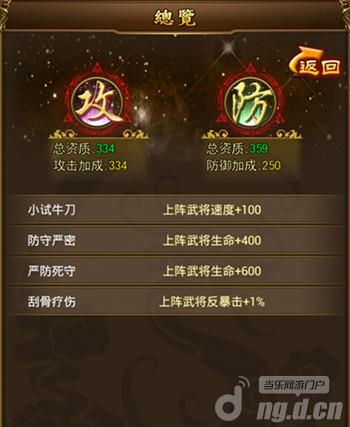 而阵法加成攻击为334,加成的防御力为250,换句话说阵法加成攻击为入阵武将进攻资质总数的100%,加成的防御力为入阵武将防御资质的约70%。