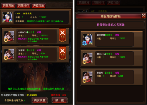新增加跨服试炼场,厌烦上千人大战?来试炼场做一个孤胆英杰!跨服游戏玩家同场比赛,比赛后按级别划分等级,在诸多大神中决出战斗力高低。
