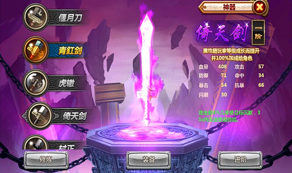 圣剑属性随游戏玩家级别发展而提高,并100%加成给人物角色。