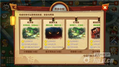 小提示:帮会每日任务都是一些很有意思的小玩法,例如打地鼠,舞狮表演吃怪物,潜进敌后这些玩法,逐渐都较难,但到了后边熟练了就很简单了~