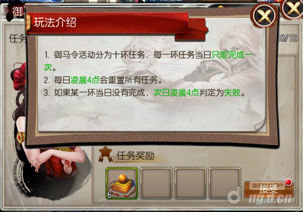御马令主题活动分成十环每日任务,每进行一环每日任务得到一次奖赏;
