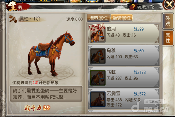 第一种方法,是每次游戏玩家得到一个新的坐骑时,这一坐骑携带基本属性就会被激话,立即提升人物的战斗能力;