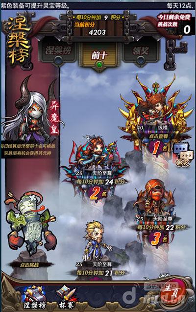 涅槃榜前5的玩家还可以另外得到击倒“异魔皇”管理权限,战胜异魔皇可得到元魂奖赏,帮助你做到更高一些涅槃人生境界,握存亡,掌循环。