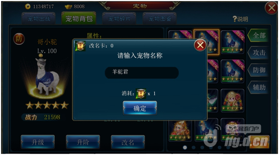 在弹出来的改名面板中,请输入要为萌宠改的名称,点一下明确,就改名取得成功啦!