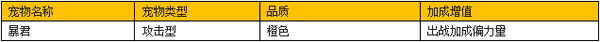 暴君为橘色极品仙宠,一听名字就明白一定归属于攻击型小宠物,上场加持偏能量,代表自已的凶悍与霸气侧漏。