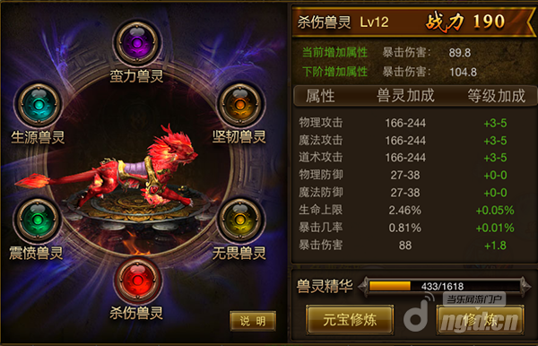 当兽灵精华达到更新需要的时候,点一下修练就可以提高兽灵级别,兽灵精华可以从商城系统选购,或全自动金币补充原材料,每一种兽灵相匹配不同类型的属性,大家可以自由选择偏重于培育的属性来演变不同类型的兽灵级别。