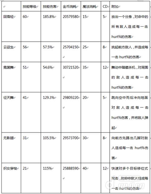 损害比排在前三位的技能各是:原始技能回雪轻、20级解锁的征天舞和40级解锁的织女星穿行。