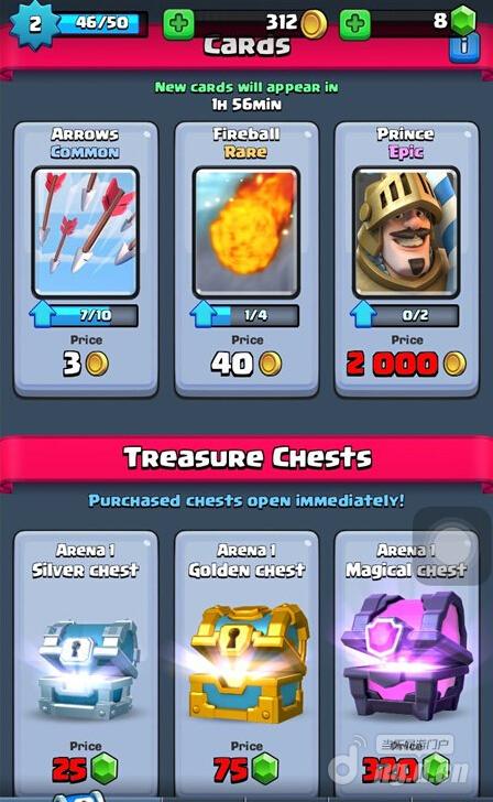 关键在于店铺,店铺用于给予玩家所需的卡牌,能用金币选购卡片,在其中卡片主要包括普卡、稀有卡和传说卡三种类型,初次选购的金币耗费分别是3、40和2000金币,可是重复购买同一种卡耗费将提升,24小时之后更新到原始价钱。