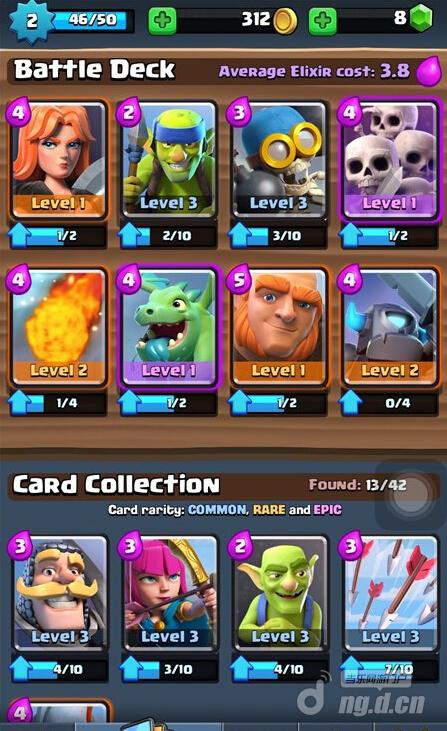 在配兵上,初学者们尽量按自己习惯性打法卡片级别进行搭配,在刚开始多更新自身爱用的卡牌,或是用级别强的卡牌。