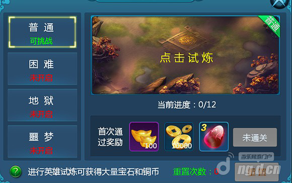试炼游戏玩法分成1人试炼、多的人试炼和英雄人物试炼,是主要游戏道具资源生产地。
