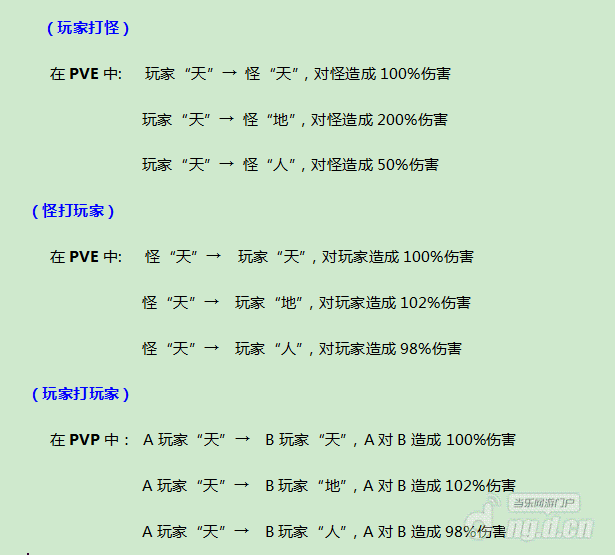 在《射雕英雄传3d》游戏里面,每一个英雄人物都有各自的属性:“天” 或 “地” 或 “人”,三者中间也是有相冲联系的,克制联系是:天克制地、地克制人、人克制天。