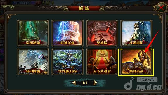 在游戏主界面点一下“修练”,便可表明巅峰挑战的玩法。