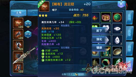 在主人公界面大家可以看到自身形象以及自己装备,点一下自已的装备能够看见自己的装备属性,能选卸掉、加强和镶嵌。