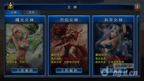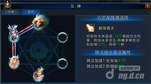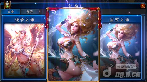 最先,在六芒星阵最上边区域的女神,是衡量激话技的关键所在,每一种女神可以激发的技能也各不相同,有AOE类技能,有BUFF类技能,有控制类的技能,也有防御力向的技能。