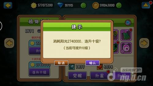 这个时候就需要你打开植物更新页面了,随意选择“更新一次”或“连升十级”,点一下就可以耗费太阳提高植物级别。