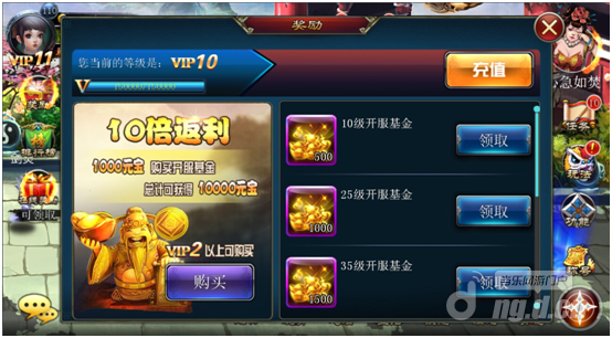 早期与中后期另一个特惠的感恩回馈,就是新开放式的正式开服股票基金,即玩家资金投入1000元宝买基金,伴随着档次的提升,便能总计得到10000元宝的盈利。