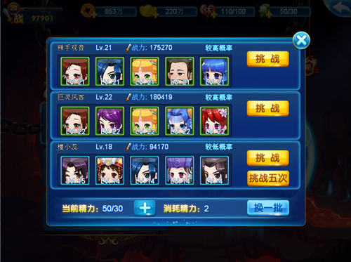 在这里页面能够看见敌人阵容、级别、战斗力及其抢夺成功概率,点一下右下方的换一批能够更新可抢夺游戏的玩家;