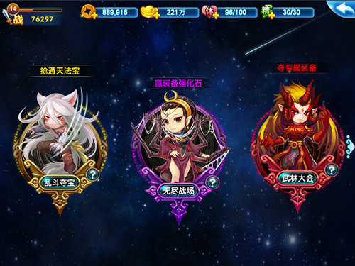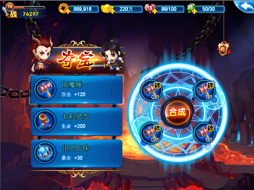 根据夺宝会获得提升进攻、防御力、血条、暴击伤害属性的法宝,不一样质量的法宝必须抢夺到不一样数量法宝碎片才可以进行生成得到。