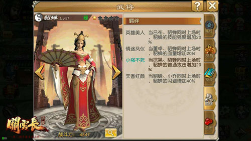 牵绊特性可大大提高战斗能力,游戏里面人物角色较多能够带上4名武将出战。
