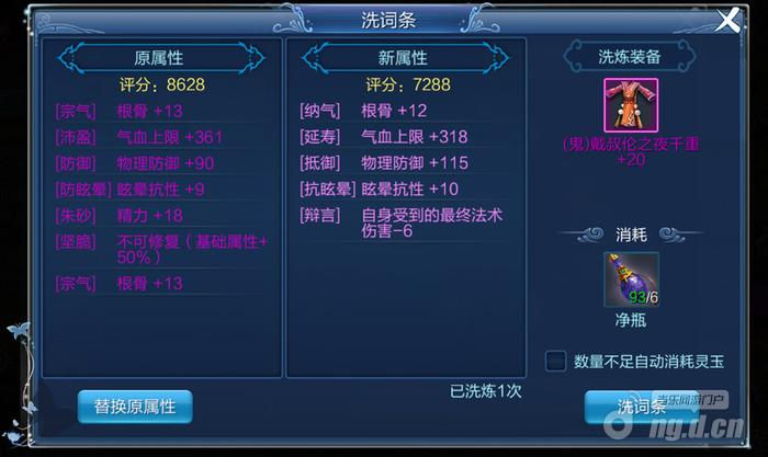 能够消耗净瓶对蓝/红/紫装开展关键词洗炼,消耗数量依据装备颜色和级别有所不同。