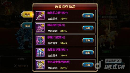在掠夺页面中,玩家可以挑选自己想掠夺的物品武器装备残片,而且见到现阶段物品挑选状况下能够掠夺的四个对象。