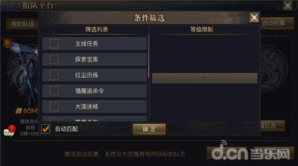 2、打开全自动招募进行全面的配对组队,在页面右上角点击设定总体目标,在弹出来的条件筛选控制面板中挑选你希望所进行的组队游戏玩法具体内容及其级别,点击明确,系统软件会自动给你配对期待开展同样游戏玩法的玩家接戏;