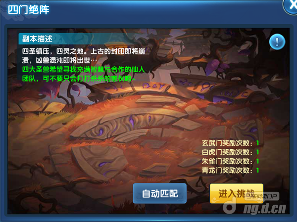四门绝阵副本由四个副本组成,各是玄武岩阵、白虎阵、玄武阵、白龙阵。