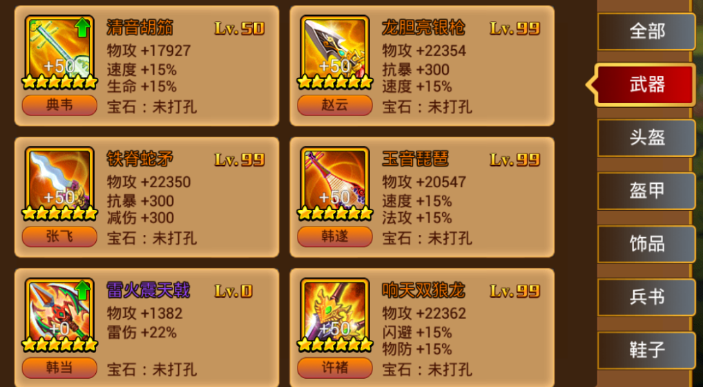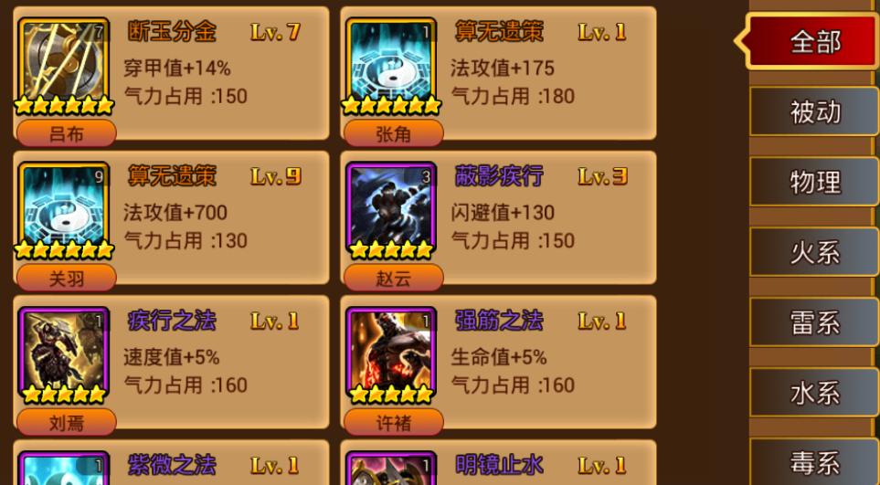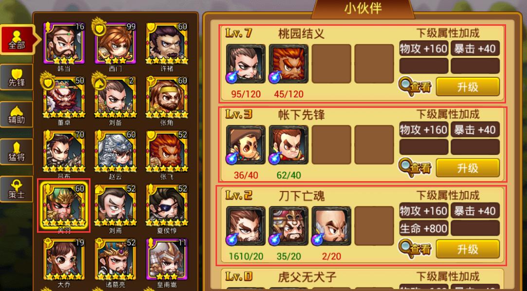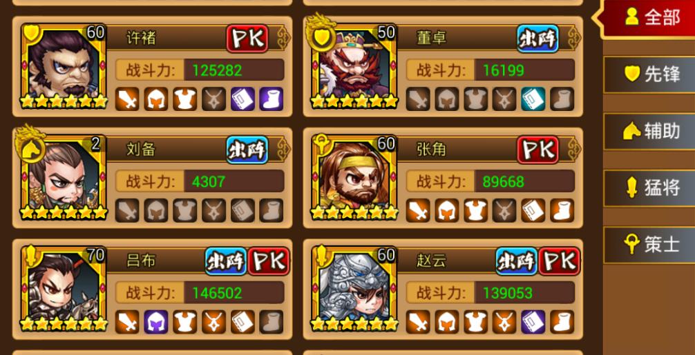武将分为先峰(防御力类),协助(加属性),虎将(物理加成),策士(法力导出)。