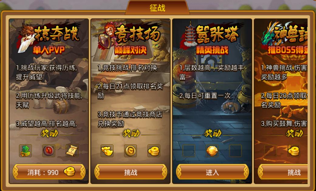 试炼场:1人比赛,可得到金币,金币灵兽试练:可获得很多金币猖狂塔:可获得很多装备精练石