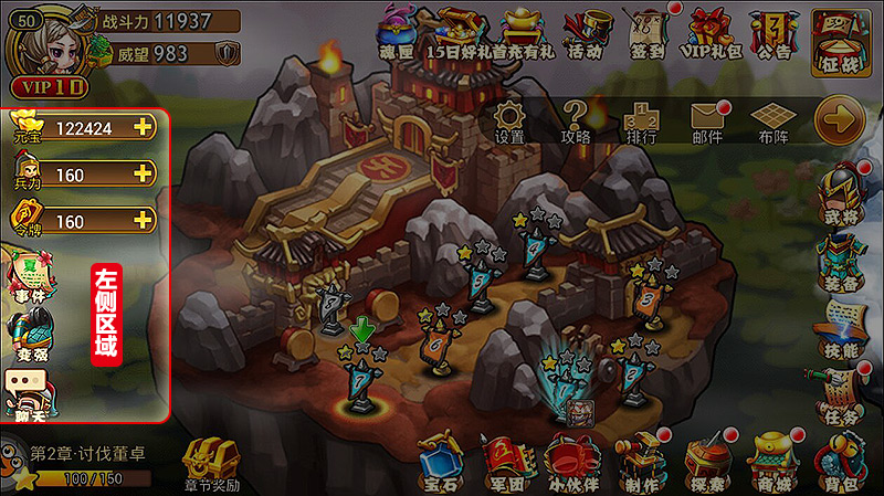 主城区页面关键分为六个地区,由副本区,每日任务头像图片,及其遍布游戏中边缘的4个至关重要的功能分区构成